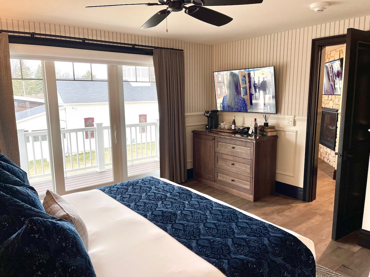 Premier Luxury Suite- The ultimate Lake Geneva retreat, these one-of-a-kind suites feature a living room with ample space and a separate bedroom. Highlights include: a fireplace, two 55” televisions, a private entrance, a large bathroom with heated floors, oversized showers, dual sinks and vanity mirrors and luxurious bathrobes.