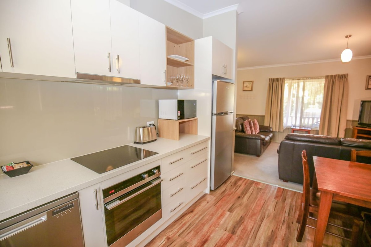 STYLISH AND EVERYTHING ALL NEW Completely gutted and refurbished. New furniture, new bathroom, new kitchenette. No expense spared. Located at the end of a quiet court with its own private, fenced garden Park your car and walk everywhere. Dog park 100m, Ovens River 150m, Bike Trail 2 blocks Town 7 minutes flat, easy walk. Or 10 minutes along the car free riverside walk Owned and operated by Holidaybright Official Site Dogs are 100% welcome inside and out