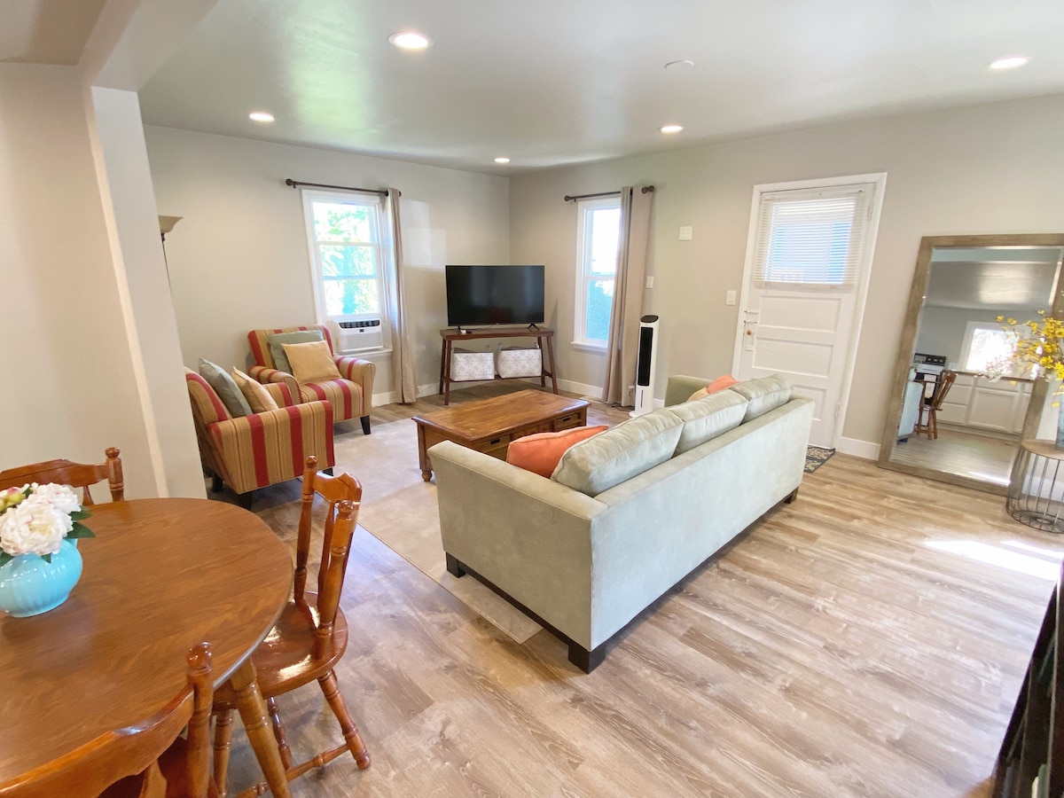 Welcome to The Ranch House, your private wine country retreat! Key amenities include: Convenience: in-unit washer + dryer Living Space: A large sectional, Smart TV+surround sound, dimmable lighting Equipped Kitchen: meal prep with oil, spices, ice, dishwasher Bedroom: Plush queen bed, blackout curtains, Smart TV, USB outlets. Whether you are here for a memorable weekend escape, a cozy base for exploring, or on business, it's the perfect space to relax + enjoy everything the area has to offer.