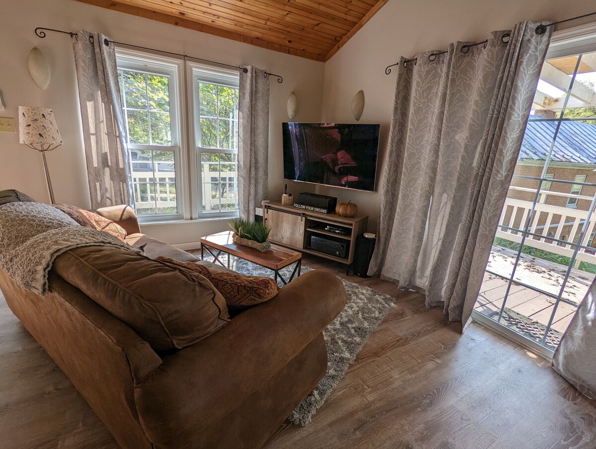Our modern studio is on the Town Run and steps away from downtown Shepherdstown. Whether you’re here for a relaxing escape or a university visit, listen to a waterfall from our cozy, zen, spa-like space with outdoor gardens. It’s an oasis with a comfortable full bed, dedicated work area, and walk-in shower. Nestled in historic downtown, you can easily explore German St., with a variety of dining options, shopping, and outdoor activities a short walk away from the Potomac River and C&O tow path.