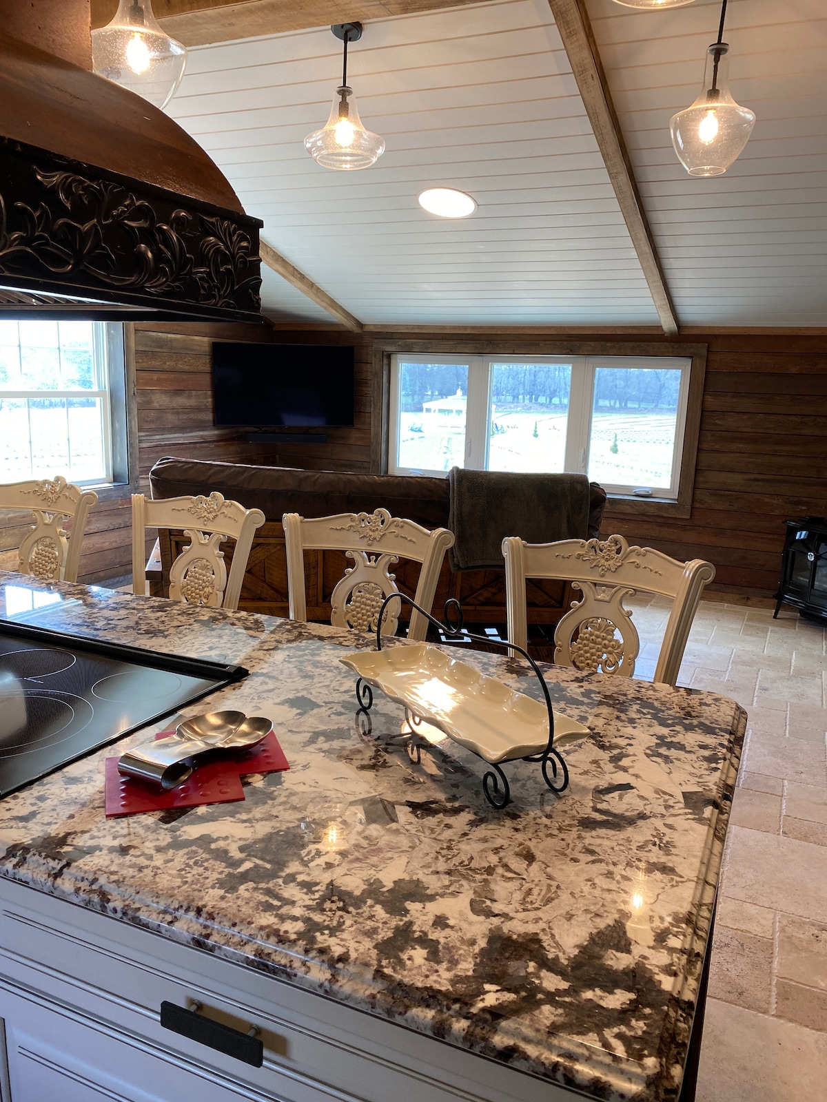 The luxury suite features reclaimed wood from a 150 year old silo. Reclaimed beams adorn the ceiling. The shower features rainfall, waterfall and massage jets. There is a four post king size reclaimed wood bed with an amazing second floor view of the entire circular lavender field. There is also an open kitchen/living room area with a view of 4,000+ lavender plants. You will be surrounded by custom-picked imported Italian granite selections. The sinks in the suite feature amethyst geodes.