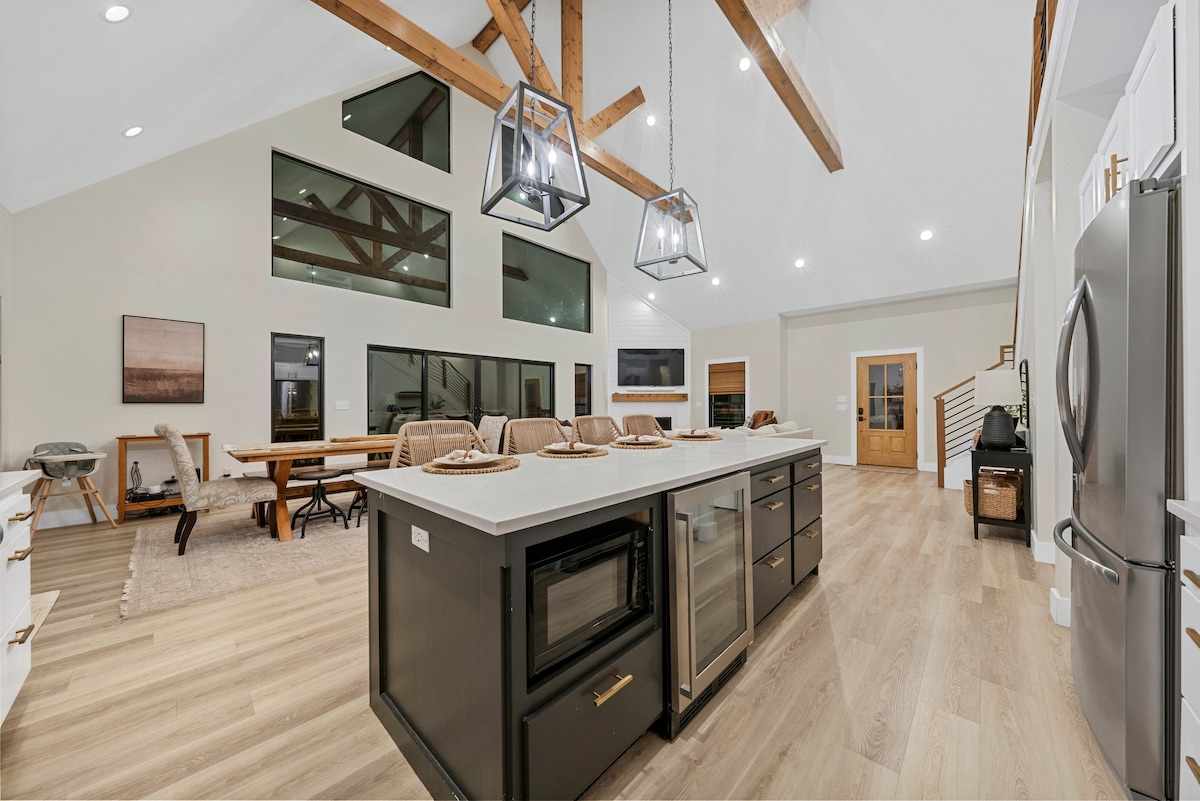 Meemac Manor, has a central courtyard/firepit flanked by 2 Bldgs both bldgs are included. Barndo 1 is 3 BR, primary w/king bed, loft w/single hide-a-bed & desk, fully eqpd. kitchen, 2 full baths, great room w/glass garage door to deck, grill & Blackstone. Barndo 2, has large BR w/king bed & full bath, a celebration room w/karaoke stage, costumes, 4 mics, piano, TV, VIP balcony, kitchenette, air hockey, ping pong, PacMan, dart board, & deck with hot tub. 84' of covered porches w/rocking chairs.