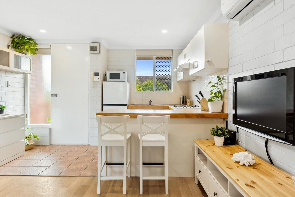 Bright and airy, self-contained European style 28 M2 studio apartment including kitchen, bathroom and washing machine/dryer on a quiet suburban street in the heart of Mount Hawthorn, 3km from Perth CBD. Bus stop nearby, 15 min to the city and 20 min to the beach! Walking distance to Pubs, shops, cafes and restaurants in Mt Hawthorn and Leederville. Off-street parking available. Access to secure common courtyard with BBQ, pizza oven, additional fridge/freezer, outdoor kitchen and clothes line.