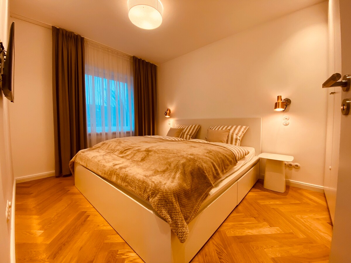Bright apartment with fireplace, hot tub, sauna, garden