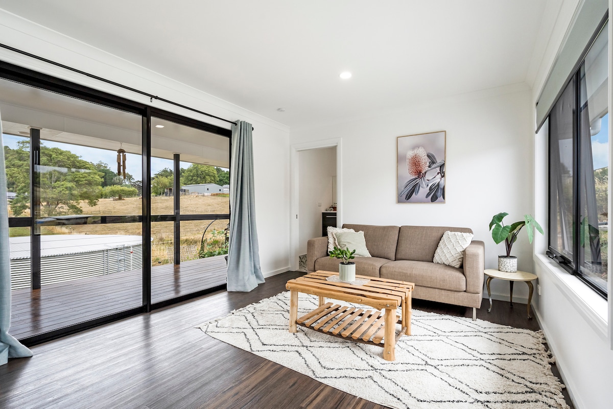 Situated on a working farm, this modern one bedroom cottage/ studio sits alongside the family home and offers guests fully self contained accommodation with one queen bed. Additional single beds suitable for children and/or 1 adult. Guests are invited to wander the extensive ornamental gardens and enjoy in sharing a wide range of seasonal produce from the kitchen garden. 10 minutes away from supermarkets, shops and sandy beaches and 15 minutes from the Spirit of Tasmania dock.