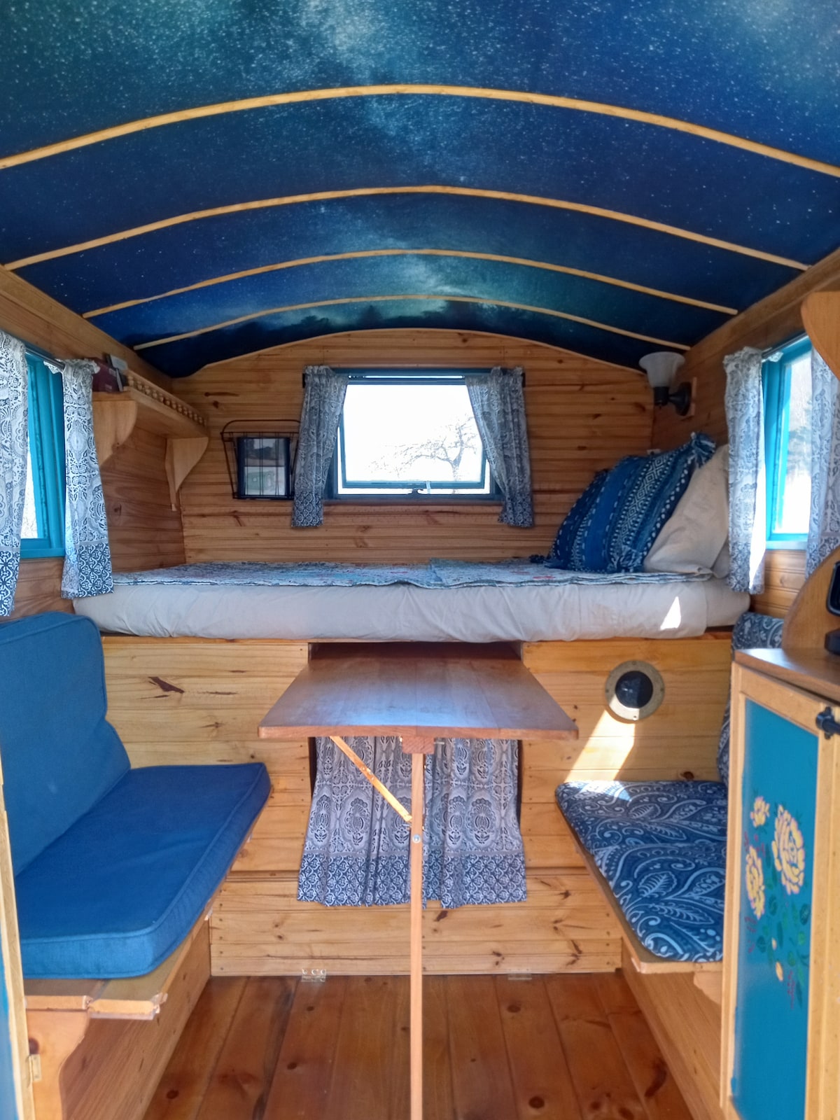 Stay overnight in a vardo, a unique and charming bohemian-style caravan inspired by 19th century English and Irish shepherd's huts. This cozy space sleeps 2 people and includes a cooking facilities, indoor and outdoor seating and free firewood. The bath house has includes a modern composting toilet, solar shower stall and hand/dish washing station. We are located close to wineries, state parks with gorges & waterfalls, lakes, the vibrant city of Ithaca, Cornell University and Ithaca College.