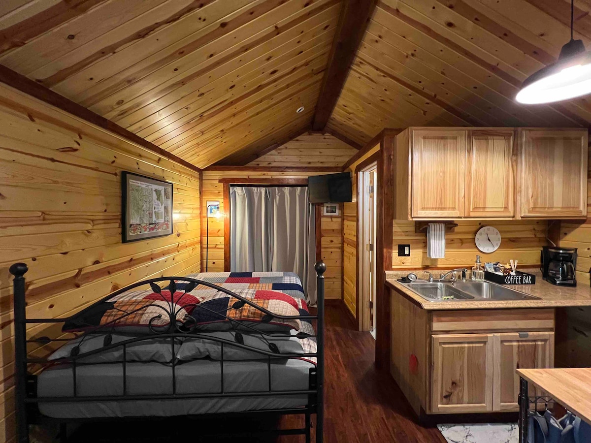 Our cabins are nestled in the trees, you will get the outdoor feel with all the amenities of town being 10 minutes away. We are pet friendly. We have a large area with a fire pit and seating. Each cabin has dishes and cookware, coffee pot, toaster, microwave, heat and, AC There are two beds (bunk bed) but you are welcome to throw out a mattress or pitch a tent next to the cabin if you have children or just need a little more room for your group. We also have free wifi.