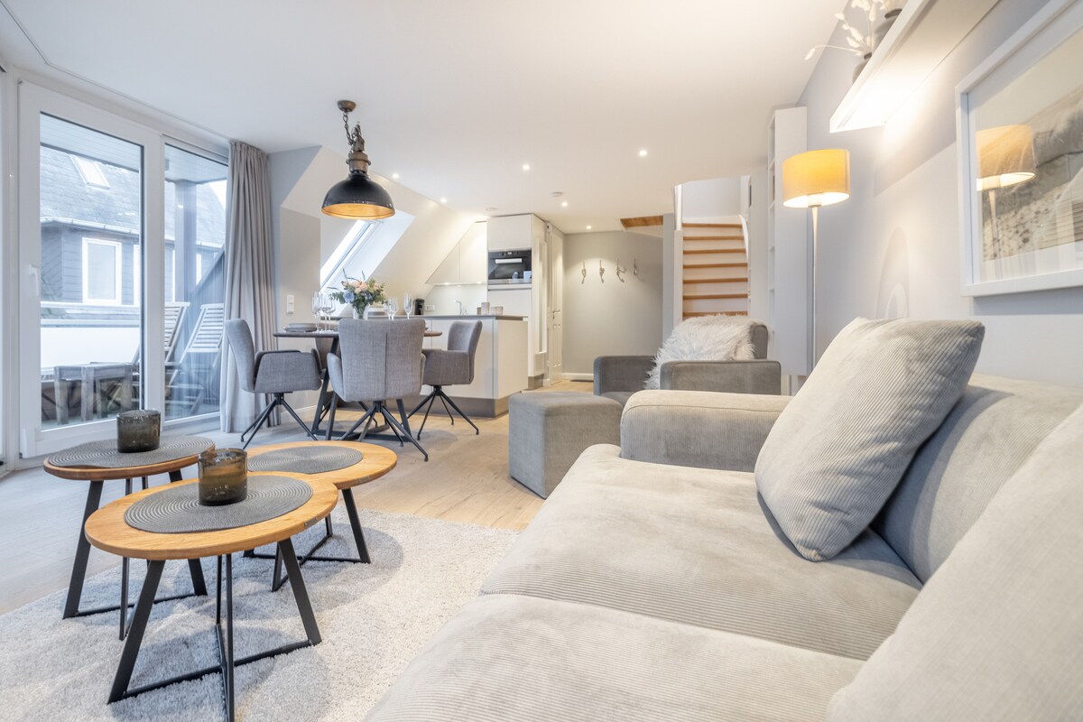 Welcome to our stylish apartment "Dünensonne 1" in the north of Westerland. Enjoy your stay on Sylt in our beautiful apartment furnished with a lot of love for detail in a quiet yet central location. The beach is about 500 m away and the center is about 1 km away. Relax in the apartment's own sauna or simply in the beach chair on the terrace.