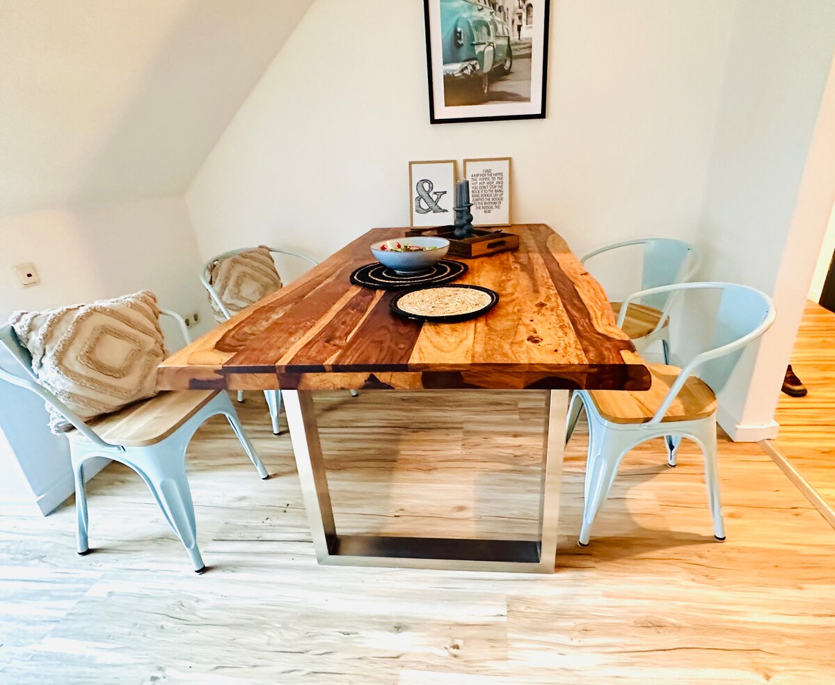 Our apartment is perfectly located between Hamburg and the North Sea - with Elbe beach right outside the door. The bright guest apartment is on the second floor of an original farmhouse. The special charm comes from old building fabric with beams and modern furnishings. The spacious apartment is comfortably furnished with a built-in kitchen, friendly breakfast area, inviting living room with fireplace and a large dining area. Everything is in one open, bright room. Now with a sauna