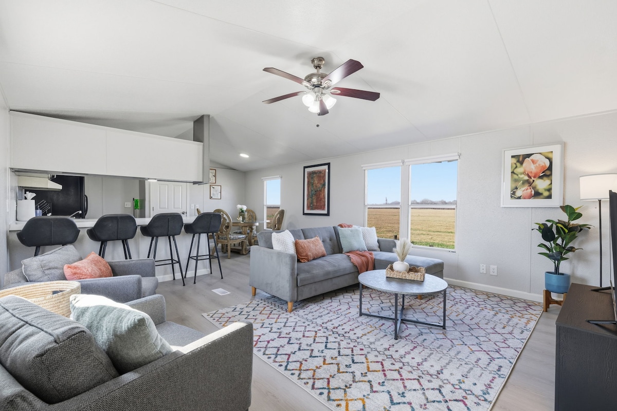 Welcome to The Oval Lodge, a high-end, fully-equipped mobile home tucked away on a unique sprawling Texas ranch. Whether you're in town for a wedding, family reunion, or youth sports weekend, this is your place to unplug, spread out, and connect. With access to unique shared sports facilities and wide-open skies, your group has space to relax, play, and celebrate, all in one unforgettable spot.