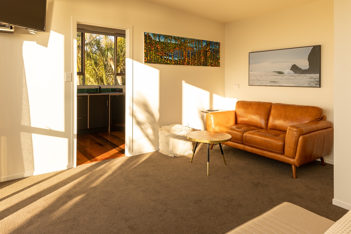 Feel your worries slip away as you journey through rolling green pastures to Coastal Acres Escape. Just 1.5 hours from the CBD and you’ve arrived. Pause for a moment. Take in a deep breath of sea air. You are standing on the deck. The Tasman sea stretches out below you between towering dune cliffs. The sun is getting low, casting a warm glow over the surrounding pastures. There is no one around. Just you and the horizon. Take a sip. Fire up the bbq. Enjoy dinner with the best view in the world.
