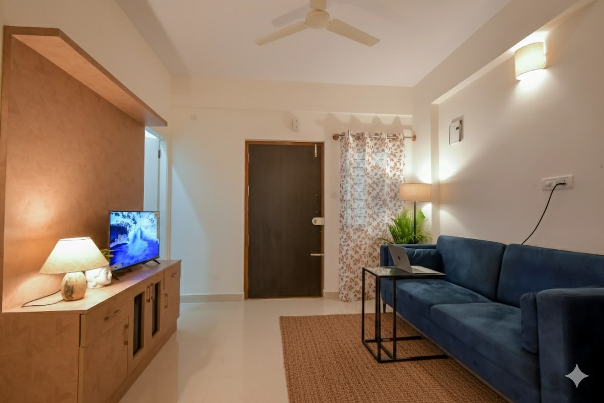 Welcome to your perfect home-away-from-home in the heart of Whitefield! This stylish and fully furnished 1-bedroom, 1-bathroom apartment is ideal for both business travelers , couples and families seeking comfort, convenience, and connectivity. Property Highlights •Wi-Fi Available •Free parking •Fully equipped kitchen •Smart TV in stylish living area •Continuous water & electricity •Dedicated workspace