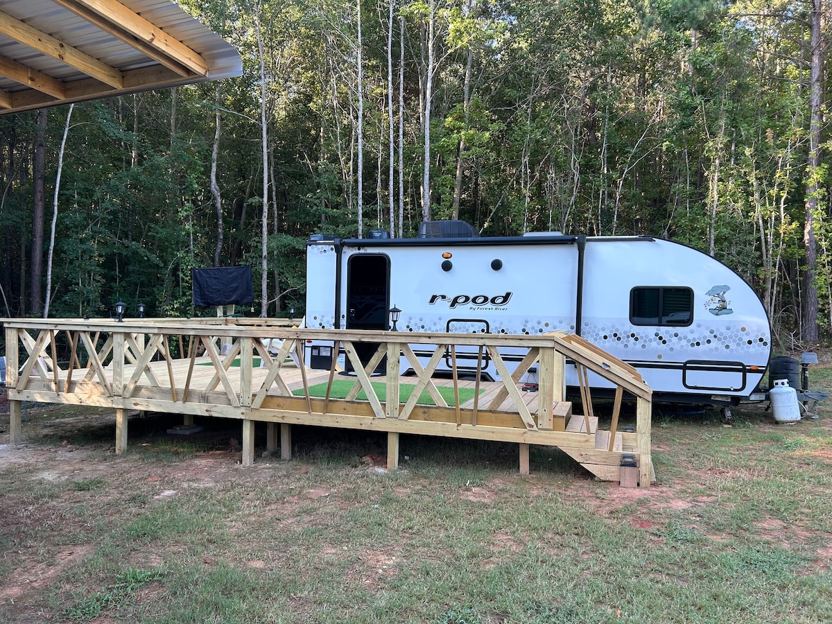 Go back to a simpler time in this totally restored 1969 Concord Traveler at Kingfish Farms. Located just a mile and a half from the quaint town of Woodruff, SC. and a little over 2 miles from I-26. Our 20 acre farm gives you plenty of room to enjoy the outdoors and get back to nature. Relax and rejuvenate in our traditional Finnish sauna and outdoor shower. Take a walk through our wooded trail and visit the goats and pigs. Enjoy the covered front porch, fire pit, and grill.