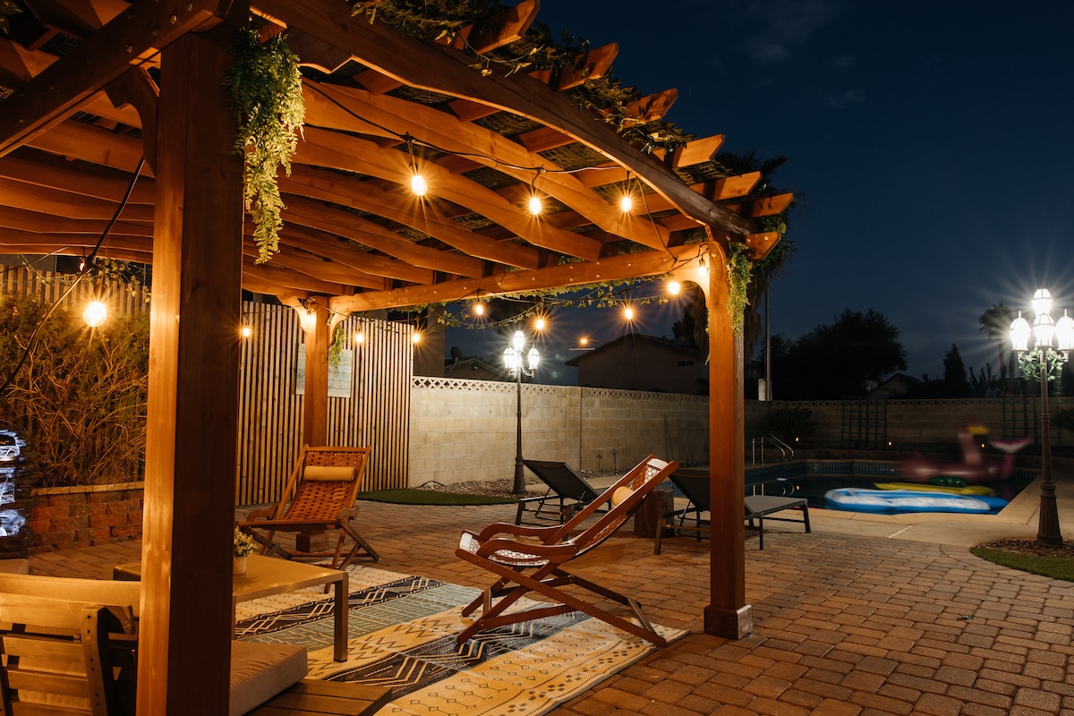 Unwind with the family at this peaceful 3-bedroom Las Vegas home—just 15 mins from the airport and 20 mins to the Strip. Enjoy sunny days by the pool and relaxing movie nights in. Located in a quiet gated neighborhood near top restaurants and casinos, it’s the perfect mix of comfort and convenience for your Vegas stay.