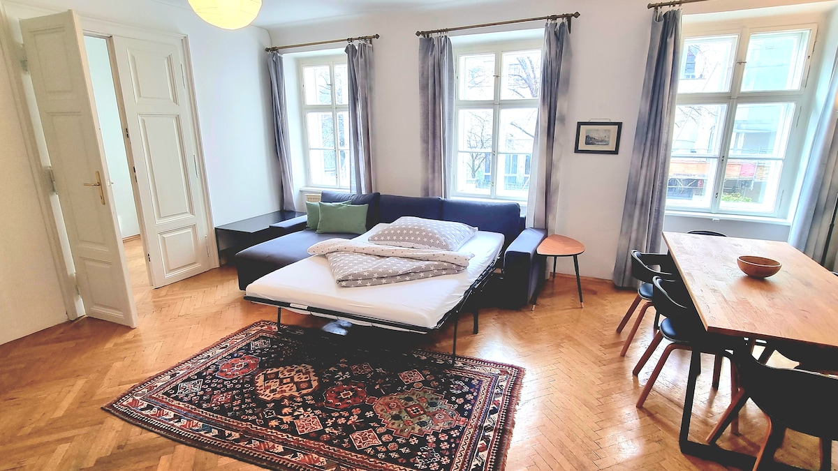 Nice and cozy Appartement near Westbahnhof, perfect for city visits or couples. The appartement has an equipped kitchen and a working chimney. With only 5 minutes of walking distance to the subway station Westbahnhof and the tramstation 2 mintutes away, it is very well connected for trips into the city center or to Schloss Schönbrunn.