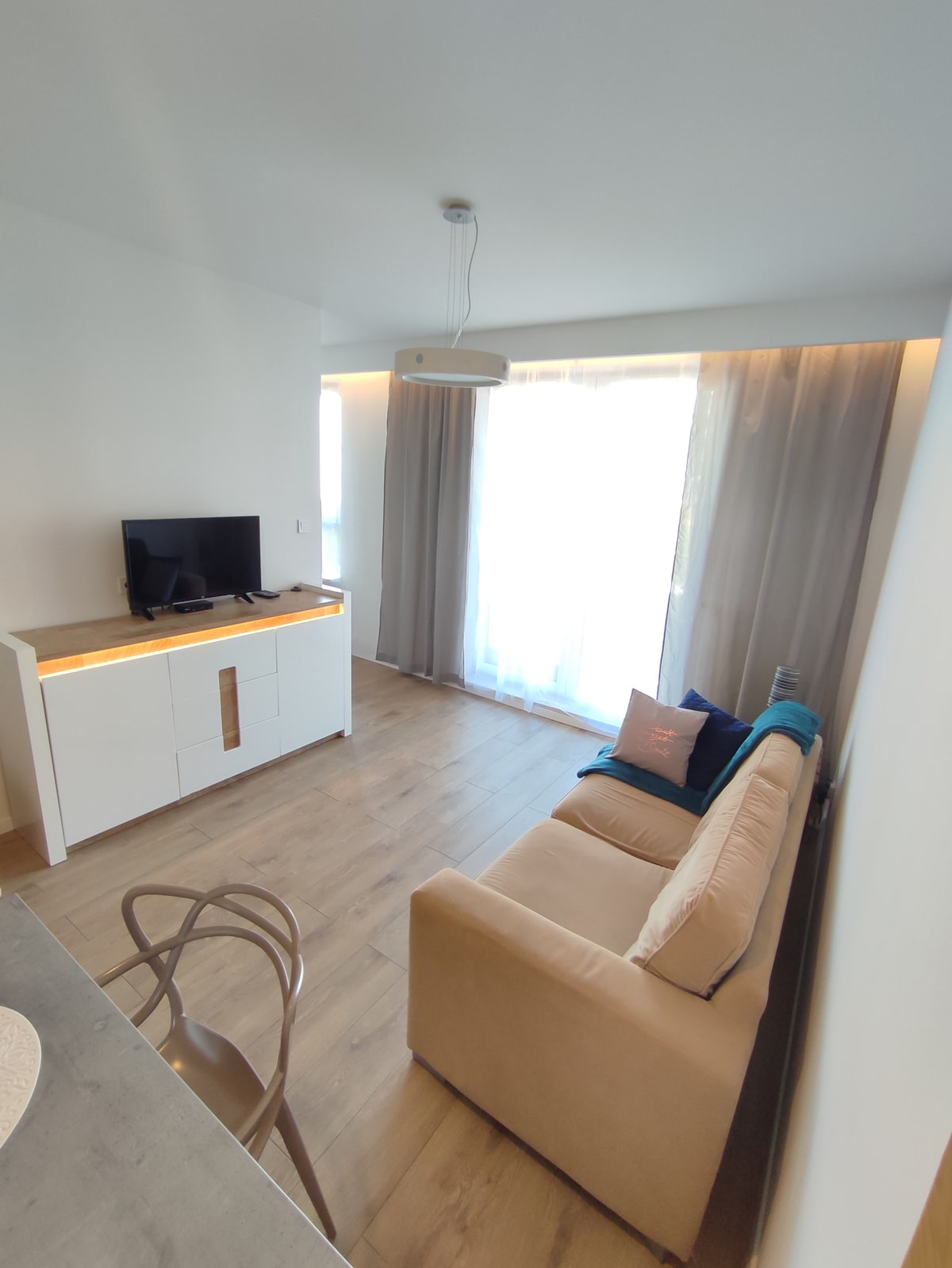 Welcome. I offer you a new, well-equipped apartment on the second floor with an elevator, consisting of a living room with a double sofa bed (180x135) with a fully equipped kitchenette (fridge, dishwasher, microwave, induction, kettle). Bedroom with double bed (140x200) and bathroom with large shower cabin (90x110) with rain shower and washing machine. Coffee, tea, sugar, salt, pepper, oil, Wi-Fi, dryer, iron, TV Free parking is available around the block. I don't have my own parking space