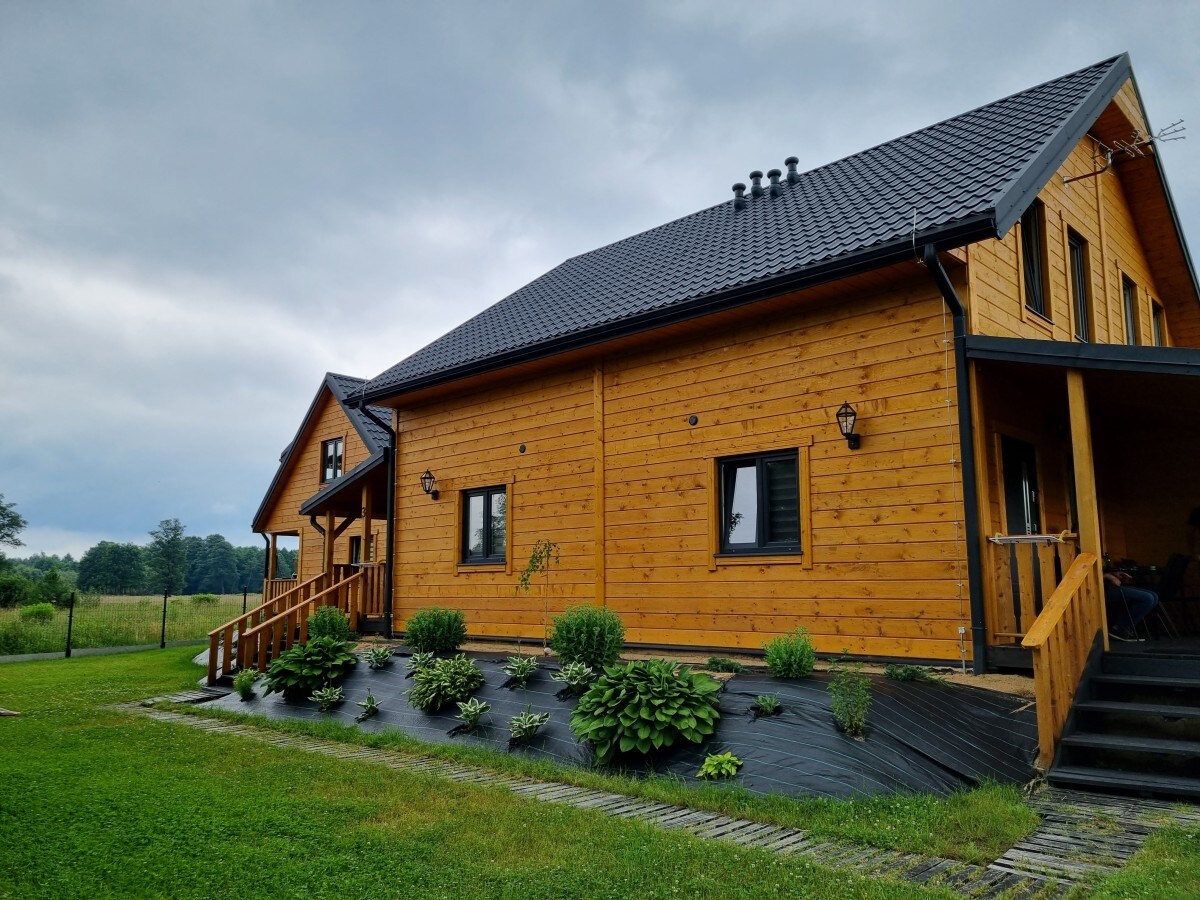 Our house is a quiet place, located by the forest, in the vicinity of Glinki, Święty and Białego lakes. Comfortable, cozy and fully equipped. Fenced. All year round. There is a large living room with terrestrial TV with an open kitchenette, 2 bedrooms, two bathrooms and four terraces, including one with a brick barbecue. We provide max. 8 beds with bedding. Fireplace with wood supply. In the vicinity there are bicycle paths, horse riding, fishing and boating. 8 minutes walk to the lake.