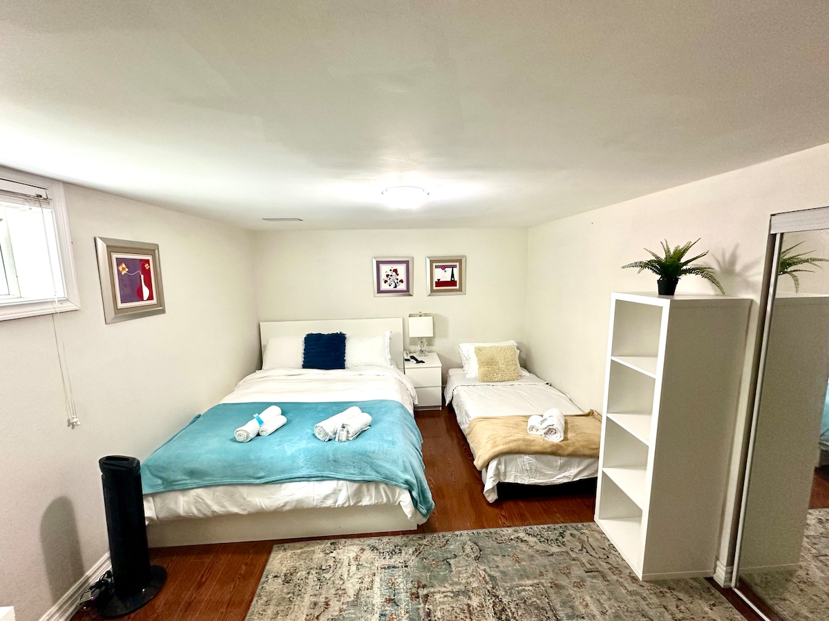 · Snowless Parking, 1 bed 1 bath, 1 living room, with full laundry and kitchen, refrigerator of course! and they are exclusively for your use! · Comfy environment with queen-size bed, cozy vibe, as well as keypad entrance to secure your safety. · Located in a quiet neighborhood. 1 minute to forest park and run field. · Provide 1 parking. 3 mins walk to bus stops. 10 mins drive to Highway 401. · Escape the busy and relax in this your premium highly privacy little basement apartment.