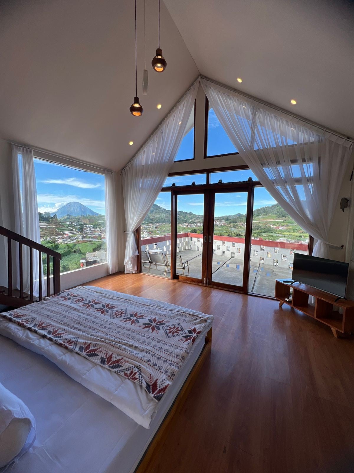 Staycation di tempat yang aesthetic dan nyaman di Dieng dengan view perkebunan kentang dan pegunungan.