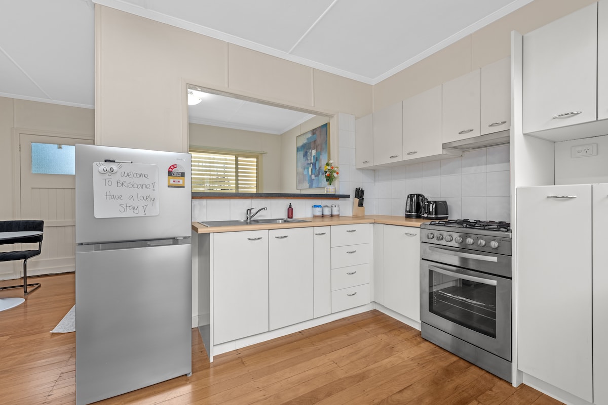 Cosy, European inspired accommodation-enjoy the private ground floor of our home.Our house is located in a quiet side street and is 5 minutes walking distance to Greenslopes Private Hospital and a 5 minute drive from Princess Alexandra Hospital. Brisbane CBD is a short 10 minute car drive and the surrounding area offers parks, coffee shops and local shopping. The accommodation is perfect for singles, couples and small families and we offer super comfortable beds and a fully equipped kitchen.