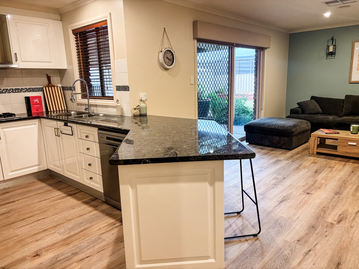Located in a quiet street, handy to Lake Victoria, Sam Art Museum, Aquamoves, many great eateries & much more, this home is ready to welcome you. Tastefully styled to ensure you have a comfortable stay with 3 bedrooms; main with ceiling fan & queen bed, bedroom 2 with queen bed, bedroom 3 with bunks, cot & S/S R/C A/C. Cosy lounge with wood heater & S/S R/C A/C & ceiling fans & ducted evap A/C in most of the home. Kitchen/dining is well equipped to your needs.
