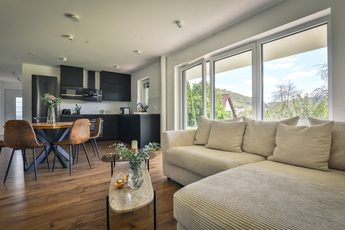 Modern designer wooden house with fantastic vineyard views and views over the Rems Valley. The apartment is located on the first floor of a detached house and has a separate apartment entrance from the outside. 15 minutes by car to Stuttgart Mitte and 20 minutes by S-Bahn. The space The apartment has high-quality amenities. Open kitchen, living and dining area. A very large outdoor terrace invites you to linger. All apartment amenities are provided