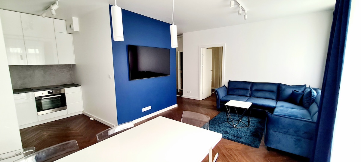 Comfortable, fully equipped apartment in a new building. A living room with an open kitchen divided into a dining and sitting area. The bedroom has a queen bed and a spacious closet. There's also a walk-in closet as an extra storage space. There are shops, restaurants and cafes in the area Equipment: air conditioning, coffee maker, kettle, iron, ironing board, washing machine Directions from Chopin Airport 20 min taxi 50 min communication from Modlin Airport 50 min taxi 120 min communication