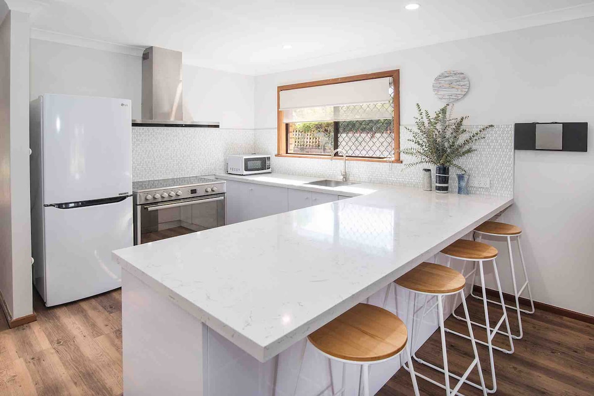 Perfect holiday home, 5 min walk to family beach. Modern kitchen, open plan living & dining room, 2 main bedrooms (very comfortable beds) 3rd bedroom double &trundle, & 2 bathrooms plus 3rd toilet. Ideal for couples & families. BBQ, & outdoor hot and cold shower. Fully equipped cook's kitchen, with everything you need. PET FRIENDLY, big enclosed backyard. Outdoor games, board games, bikes, tree swing, 3km walk to jetty, supermarket & liquor store, 150m walk. NOT LEAVERS SORRY