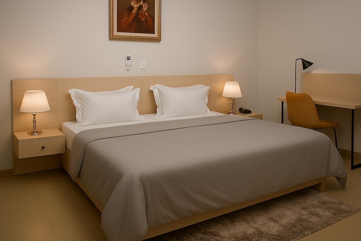 Bienvenue à la Résidence La Paix . Ce studio Cosy , lumineux et bien aménagé , offre un espace intime et confortable pour un séjour agréable à Yamoussoukro. Idéal pour les voyageurs seuls ou en couple , il dispose d'un coin salon , d'une kitchenette et d'une salle de bain privée . Un hébergement charmant et paisible , parfait pour se détendre et profiter d'un séjour serein au cœur de la ville.