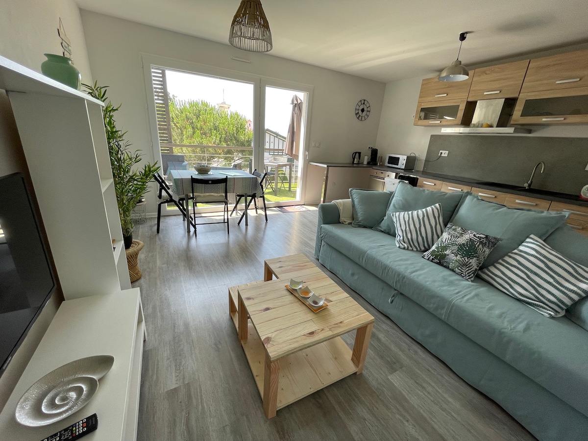 Nestled under the oaks and quiet, we invite you to discover our charming new 40 m2 studio, ideally located between Arcachon and Cap Ferret. This studio, both spacious and comfortable, is equipped with a modern kitchen, reversible air conditioning and a workspace equipped with a fiber connection. A parking space is available with the possibility to recharge your electric vehicle.