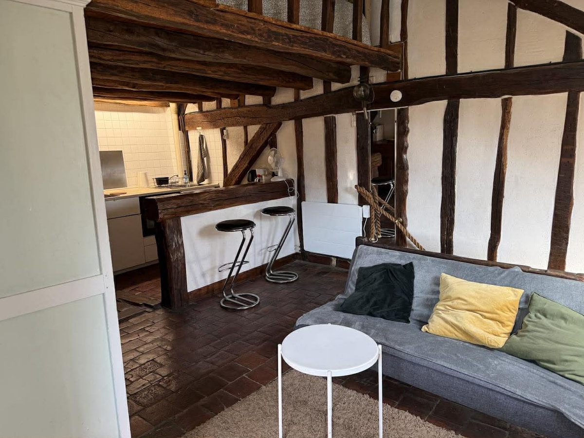 Accommodation in a 13th century building. Authenticity guaranteed: half-timbered, beams, tiles. Pedestrian street at the foot of all shops. Possibility of bicycle garage. For breakfast, tea room, pastries 10 m away. Mezzanine bedroom and sofa and armchair bed. Possibility of bike garage near studio