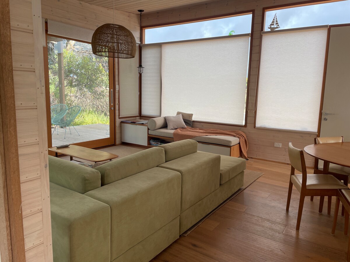 North facing warm and bright shack that makes the most of the sun all year. This is a contemporary take on a 1950's beach shack with louvres to make the most of sea breezes. It is situated opposite a reserve, 200m walking distance to the two main beaches, with a quiet off-road walking path directly in front of the house that cuts through directly to the popular penguin point beach. There is large deck to enjoy the surrounding natural vegetation equipped with festoon lighting.