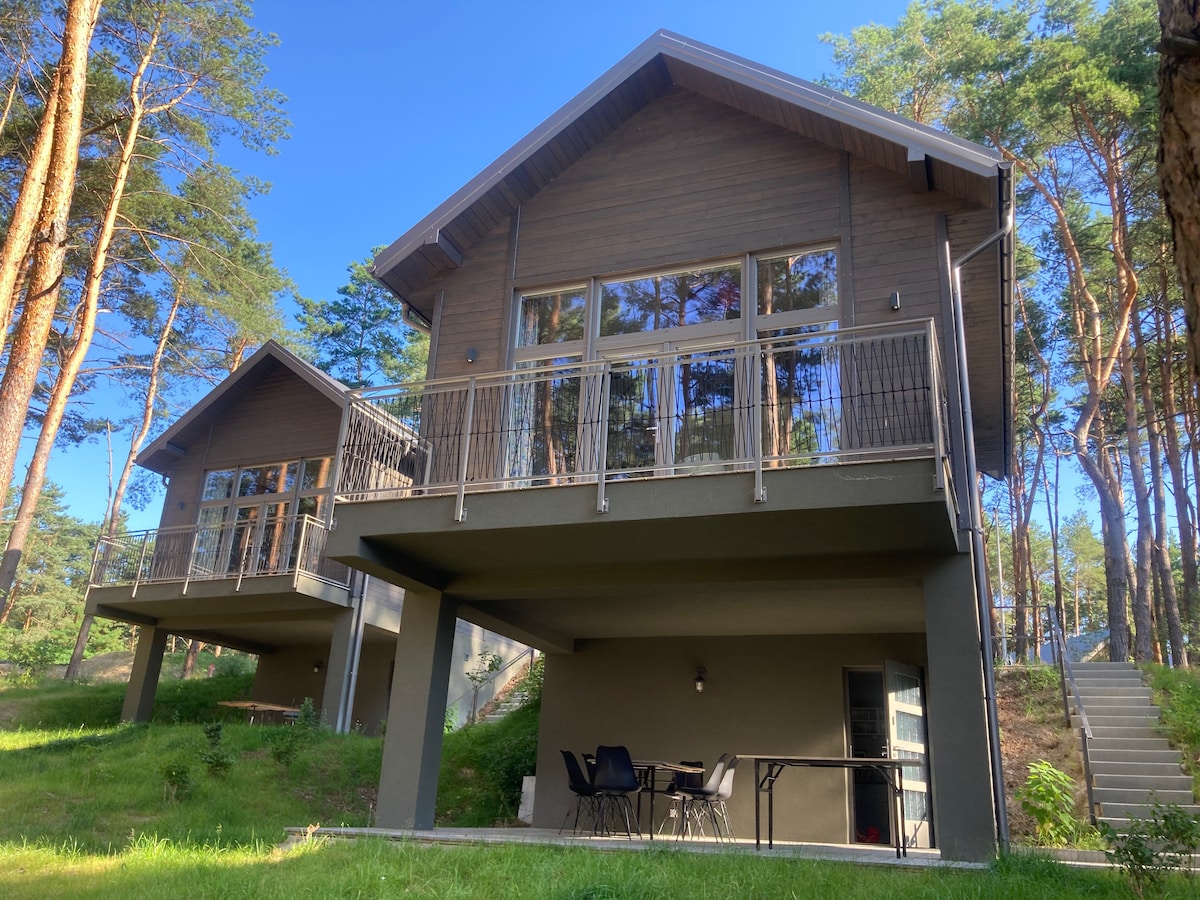 River in front of the deck, forest all around, half a hectare just for you. Days start with coffee and mindful breaths, and end with a sauna, cool pool dip, and quiet hot tub under the stars. Wooden log cabin (6 guests): 2 bedrooms + sofa bed, fireplace, riverside gazebo, pool bar, lounge corners. No shared areas—complete intimacy and boho-slow vibes all year long.