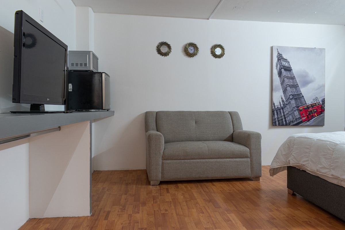It is a quiet, modern, central, new and cozy space to have an excellent short or long stay in the beautiful city of Zamora The space A separate studio with electronic lock for greater comfort which has all the amenities such as AIR CONDITIONING, hot water, Netflix, high speed internet Highlights Just 13 minutes from downtown Sentura shopping mall 10 minutes away Bodega Aurrera with BBVA ATM 4 minutes away Oxxo 4 minutes away