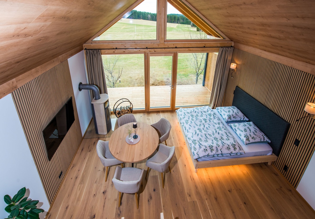 The newly built wooden chalet was completed with a lot of love for detail in March 2024. It was built in a modern style and meets the highest energy requirements. The path from your own parking space, through the house, to the covered veranda with new, electrically heated hot tub was designed at ground level. Inside you can make yourself comfortable with the wood-burning stove and your own sauna (free of charge). The National Park cycling path and beautiful hiking trails are within walking distance.