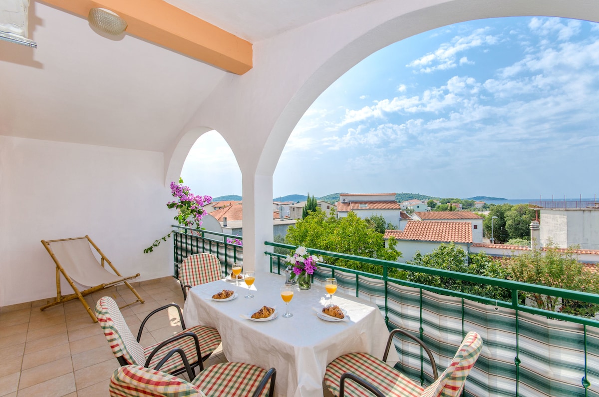 Four star apartment Stella is the only one on the Trogir waterfront with a balcony and sea view. This charming and modernly equipped apartment with a large balcony is perfectly situated on the main Promenade of the UNESCO- protected Old Town of Trogir. The city beach is 500 metres away.