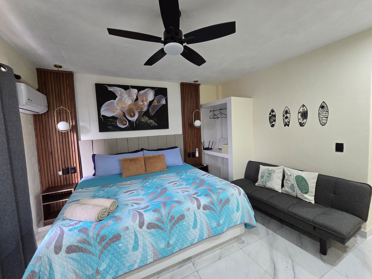 Relax in this unique and quiet getaway. "Cozy apartment in the heart of downtown Zihuatanejo, just one block from the main beach. Enjoy a partial ocean view and nightlife at nearby restaurants, bars, and shops. This small apartment has everything you need for a comfortable stay: equipped kitchen, bedroom with king size bed and private bathroom. Ideal for couples or travelers looking for a relaxed stay with easy access to everything."