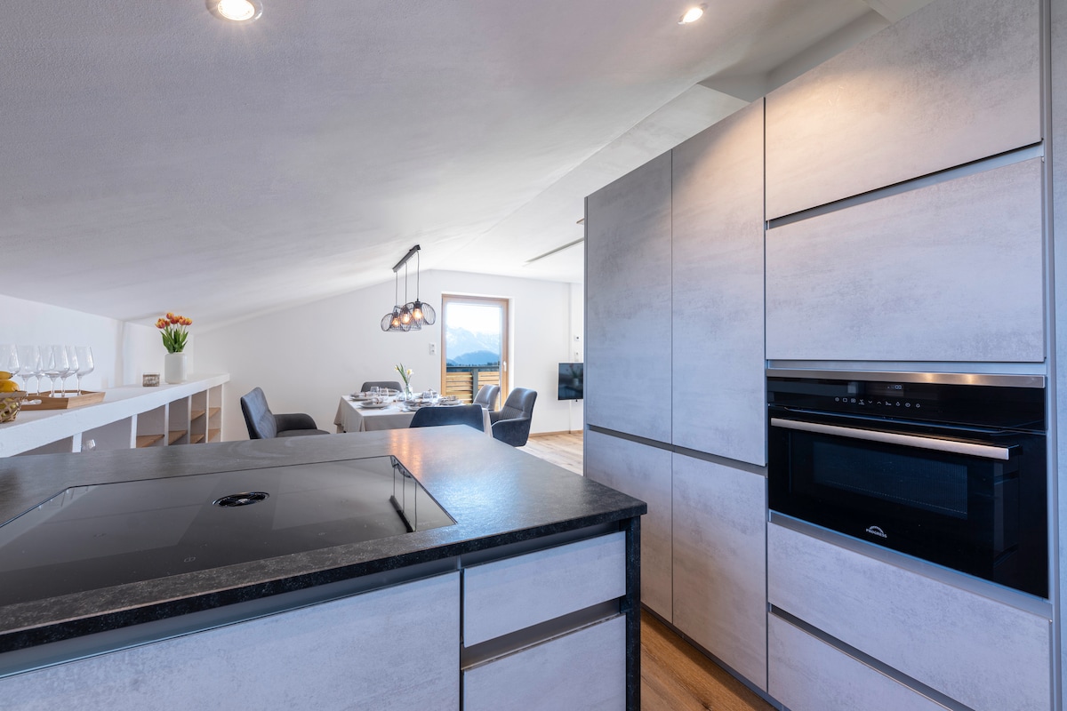 Welcome to the panoramic lodge – your retreat in the Salzburger Land! Experience a stylishly furnished, light-flooded apartment with a spacious layout, separate entrance and modern comfort. Relax by the traditional tiled stove, enjoy the magnificent panoramic view from the balcony or spend quiet hours on your private terrace with seating and sun lounger – ideal for unwinding.