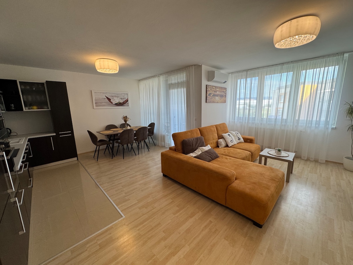 Kick back and relax in this calm, stylish space. A fully furnished apartment offers you everything you need. In the fully equipped kitchen, you can comfortably prepare your morning coffee or your favorite breakfast, which you can enjoy on the spacious terrace with a beautiful view. You can relax after work or a long trip by watching your favorite series in a cozy living room. Of course, there is private free parking in a reserved place directly in front of the apartment building.