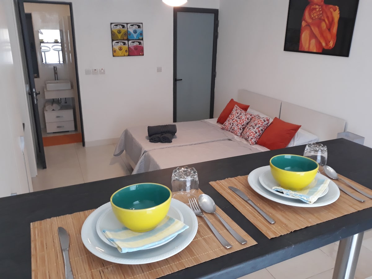 This contemporary and cosy open plan apartment is ideal for a romantic getaway or small family holidays. Just been refurbished including new bathroom. Plenty of relaxing space, with large double bed & sofabed. Airconditioners (cooling & heating), TV and free WiFi. The kitchen features all appliances including microwave, electric kettle & coffee machine. Large balcony with sea view. A rare property to find, close to the sea, beautiful promenade & close to many restaurants and cafeterias.