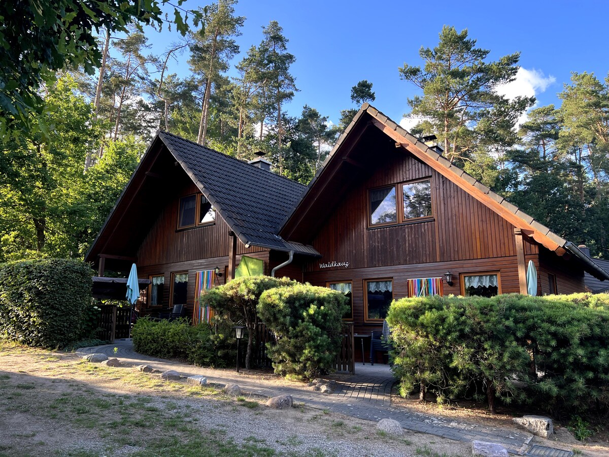 The wooden house is located directly opposite the old sanatorium, only about 50-100 meters from the swimming area on the clear Zenssee. Each unit in the semi-detached house offers ample space for 7 people (3 bedrooms) on two floors, a fireplace and a terrace with a small garden. Bicycles can be stored in a lockable shed. Near the house there is a supermarket with bakery/butcher as well as a canoe rental.