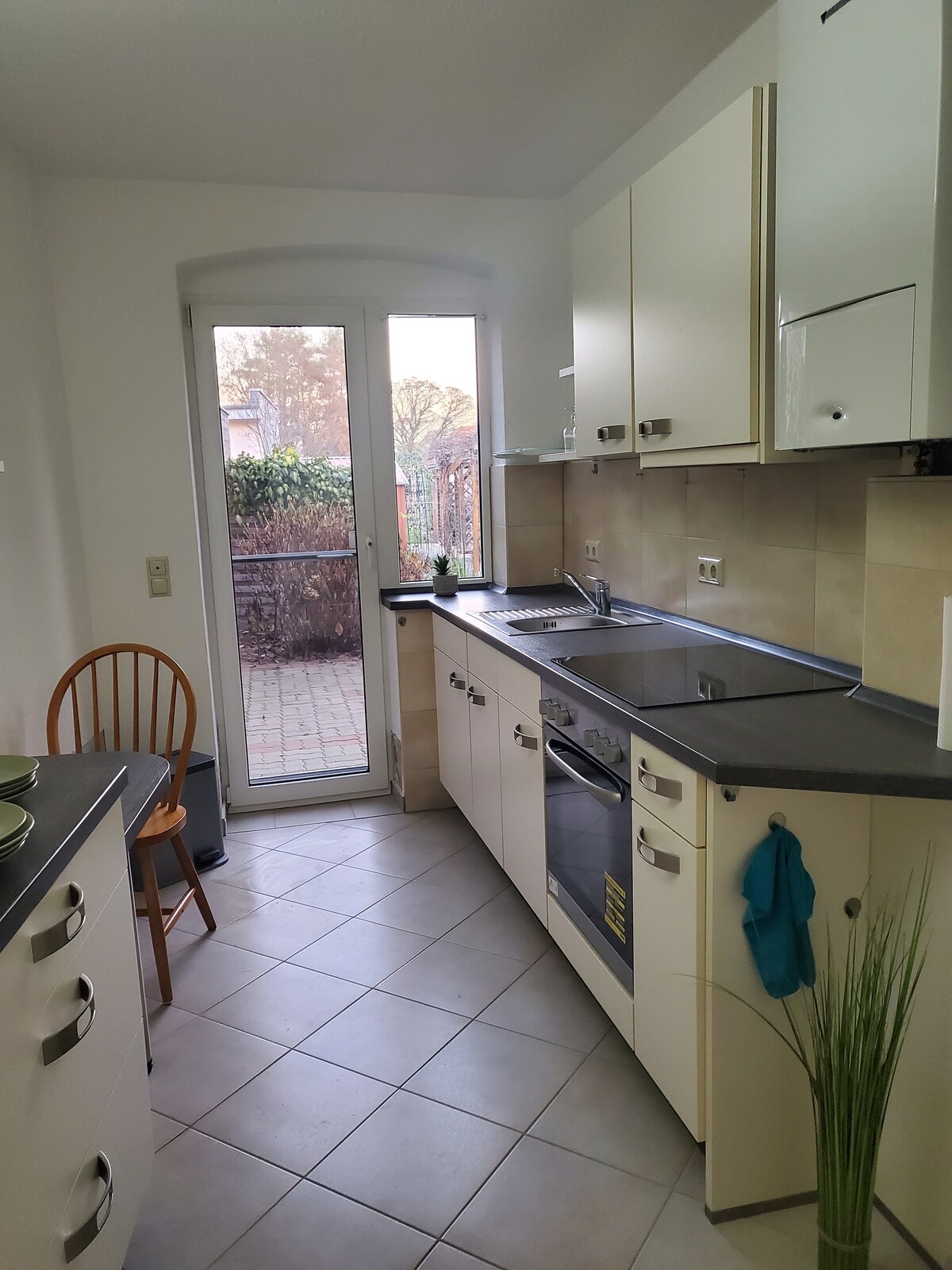 You have a separate entrance (photo) in the single-family house to a 41 m² apartment with bathroom, small bedroom, hallway and spacious apartment with kitchen incl. kettle, toaster, coffee maker. Everything on one level without stairs or steps. A Kinderkraft Sofi plus baby crib and highchair are provided free of charge. The apartment is very quiet on the outskirts of Greifenhain (Saxony). A bakery is nearby. You can park for free directly on the premises.