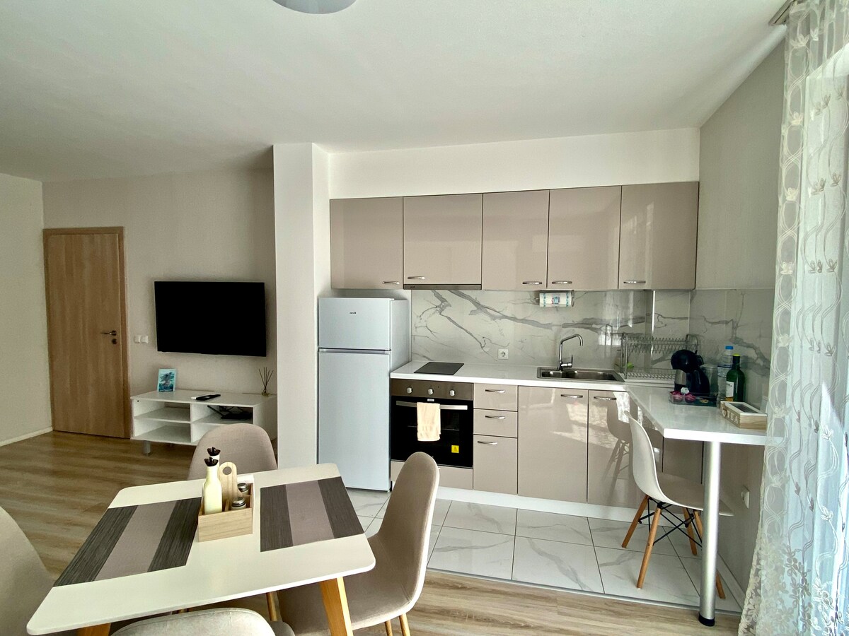 Stylish and bright apartment in central Varna within walking distance of the Sea Garden and beach. Perfect for couples, business trips and remote work. Features fast reliable Wi-Fi, dedicated workspace, fully equipped kitchen, air conditioning and sunny balcony. Easy self check-in for flexible arrival. Suitable for short and long stays The apartment is in a convenient central area close to everything you may need • 5–10 min to Sea Garden • 5–10 min to city centre • easy public transport access