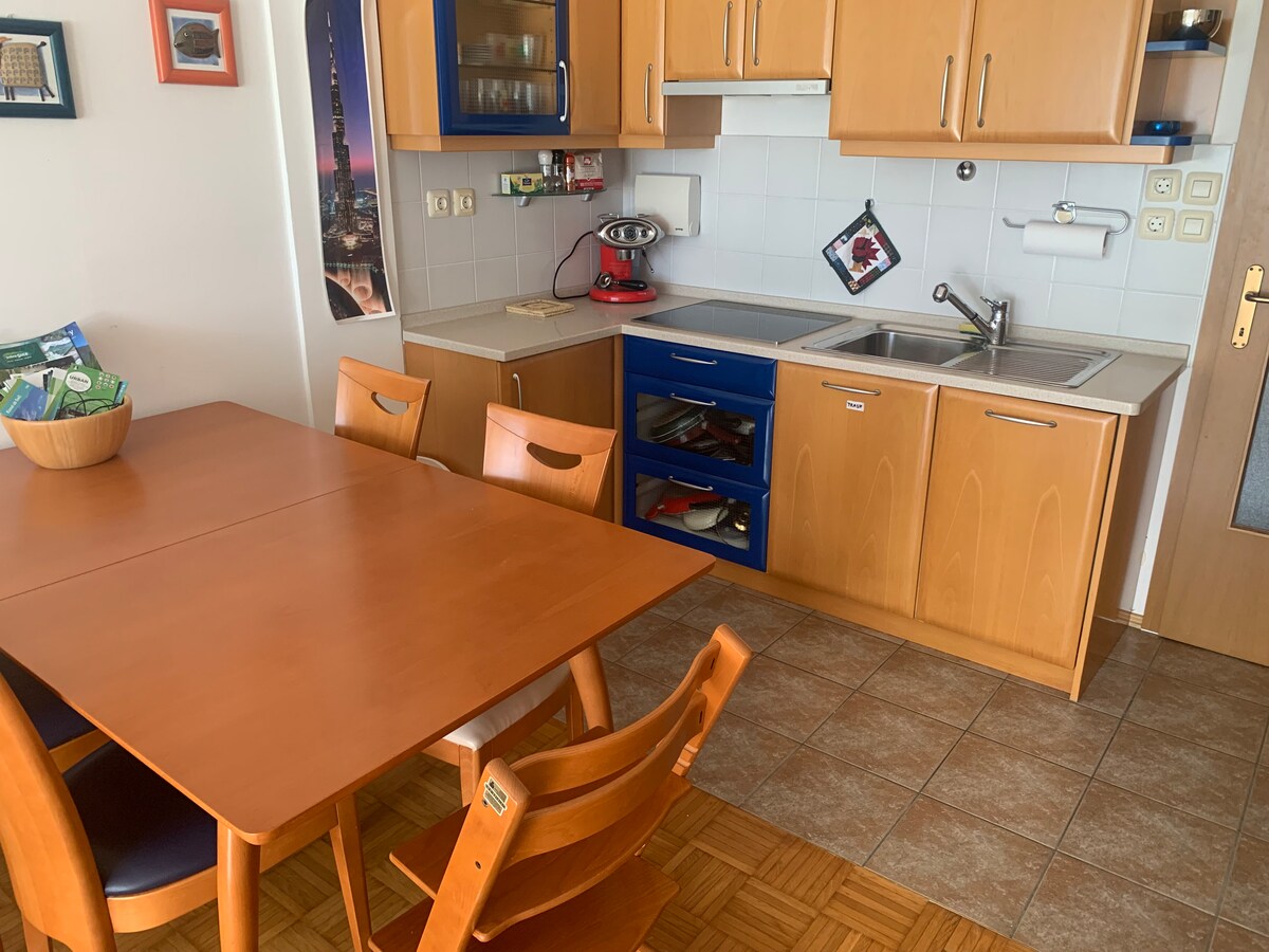 Apartment Maja with two bedrooms is located right next to the ski slopes and the bike path in Kranjska Gora. It will welcome you with a fully equipped kitchen, bathroom, dining room, two bedrooms and a comfortable sofa in the living room. A bioethanol fireplace creates a romantic atmosphere. There is a TV in every bedroom and living room. Suitable for families, friends or a romantic getaway. :)